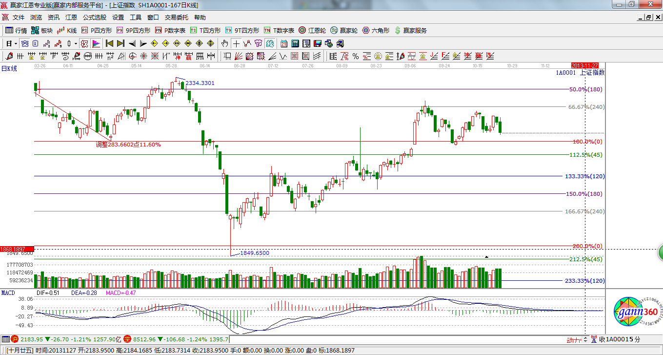 ☆依據贏家江恩系統波段百分比延伸提示:江恩百分比0度是2160;