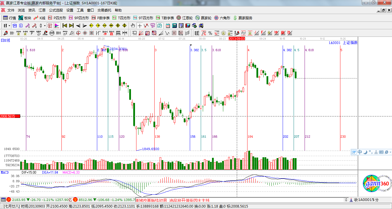 ★依據贏家江恩系統乾坤K線提示: 紫色K線出現,等待趨勢明確,轉綠則進入休息;