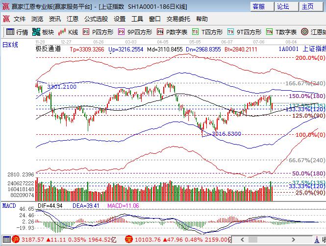 周二大盤低開震蕩小漲0.35%,幾大指數全線小漲,午盤創業板帶領下震蕩攀升。板塊方面,鋼鐵、煤炭和有色領漲,家電、銀行、石油、券商等下跌;題材方面,圍繞漲價、中報預增、一帶一路幾個方面,開板新股和一些高位白馬股走勢相對較弱,個股上漲居多,成交量同前期7月中上旬持平。技術方面,除日線外15、30、60均跌破極反通道生命線,短期生命線在3197附近為今日盤中阻力點,日線震蕩后還有回踩生命線的概率,擇時在將7月6號附近減的籌碼回補,當前策略就是等待,倉位保持在4成,3174、3158為日內支撐,3197、3202為日內阻力,僅供參考,不構成任何投資建議。