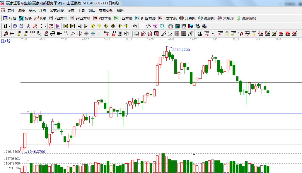 今天兩市在生命線下方繼續呈現弱勢整理走勢,盤面上,雖有銀行股護盤,但仍沒有擺脫弱勢格局,早盤受益優先股消息的電力股表現活躍,環保,煤炭,漲幅靠前,相比之下,前幾天活躍的油改概念出現回落,技術面:今明兩天是時間窗口,指數面臨方向的選擇,持續的縮量震蕩,好像等待一種政策的降臨,近期的平臺整理略顯向下突破的跡象,可是當下跌至危急關頭,都有護盤資金的出現,總之在沒有明確方向之前,多看少動為主。