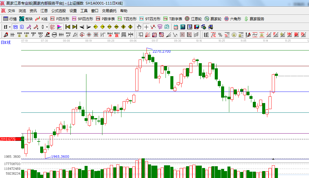 ☆依據(jù)贏家江恩系統(tǒng)波段百分比延伸提示:黃金分割價(jià)格圖0.236位置是2219點(diǎn),0.382位置是2050點(diǎn);
