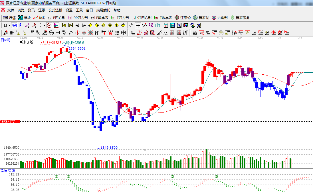 ★依據(jù)贏家江恩系統(tǒng)乾坤K線提示: 紅色K線看多,出局線與關(guān)注線金叉;