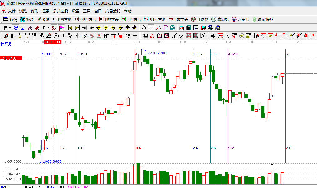 ☆依據贏家江恩系統波段百分比延伸提示:黃金分割價格圖0.236位置是2219點,0.382位置是2050點;