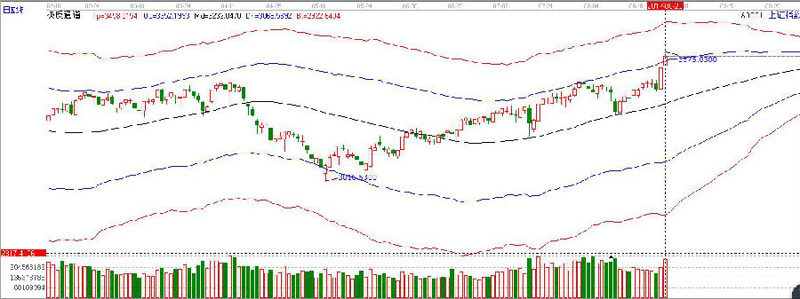周一,滬指高開高走,強勢突破極反通道藍(lán)色上軌線,打開了新的上行空間,盤中最高沖擊45度線3380點附近,量能同比放大,但在沖高過程中五大行和一批行業(yè)龍頭股有出貨的跡象,所以,短期指數(shù)上行中或仍有反復(fù),短期不宜盲目追高。操作上,輕指數(shù)、重個股。不追高的前提下,低吸低位放量,具有業(yè)績支撐的良好標(biāo)的。