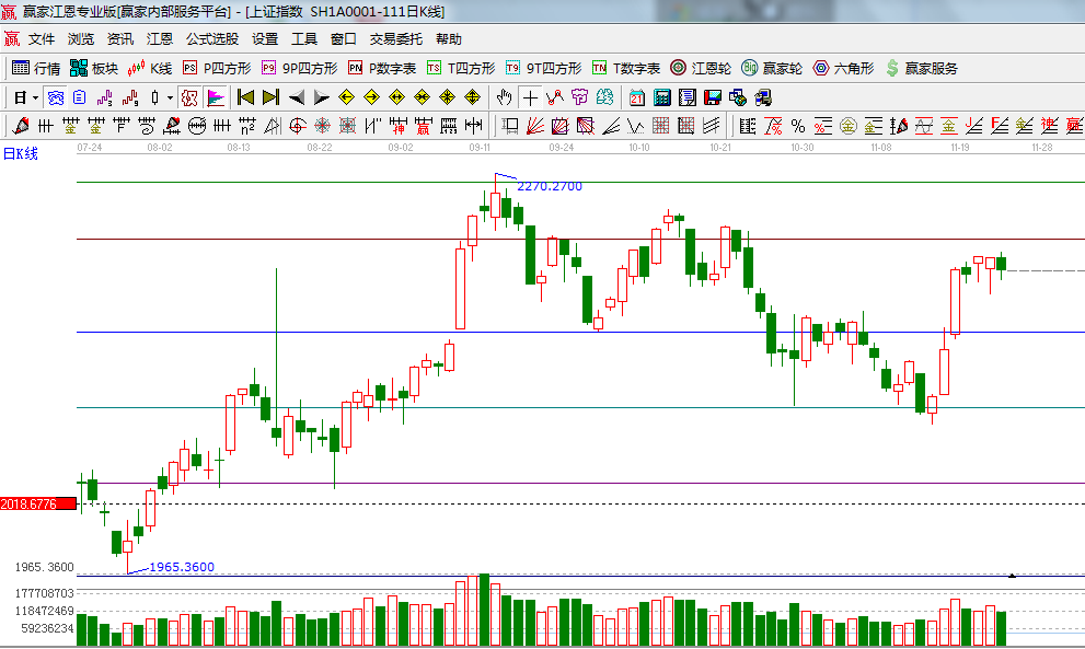 本周初18號滬指放量中陽突破江恩軟件極反通道生命線2170位置,隨后轉入橫盤震蕩格局,市場賺錢效應與活躍度增加成交量顯著放大,市場熱點圍繞改革題材炒作,如二胎開放、軍工、天津自貿區,特別是進入年底行情高送轉概念股也將成為持續的熱點,滬指趨勢不破極反通道生命線處于安全操作區投資者可繼續這類短期調整后的機會;技術方面從K線組合判斷中陽橫盤后遇到費氏時間將出現方向選擇,通常時間窗為陽線后的第3天、5天、8天,重點觀察市場下周初變化,波段思路看好未來行情,倉位上可保持在5成或5成以上,短線、波段結合操作;