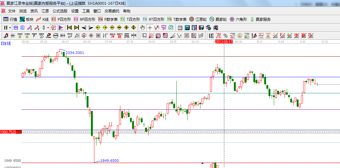 ☆依據贏家江恩系統波段百分比延伸提示:2444與1849點做黃金分割價格圖,0.382位置是2217點,0.5位置是2150點;