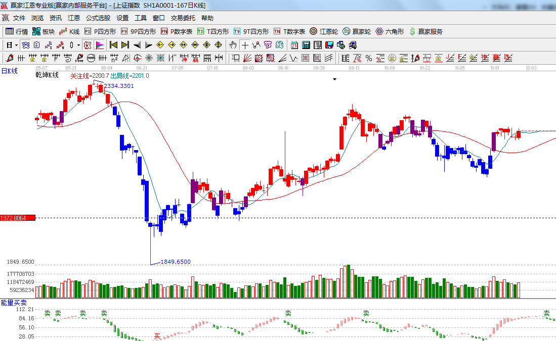 ☆依據贏家江恩系統波段百分比延伸提示:2444與1849點做黃金分割價格圖,0.382位置是2217點,0.5位置是2150點;