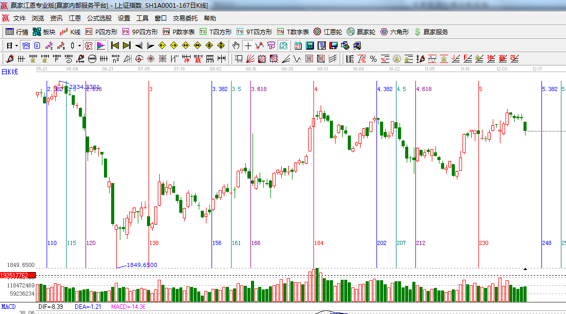 ★依據(jù)贏家江恩系統(tǒng)黃金時(shí)間周期線提示:17號(hào)為黃金分割的0.382的位置,重點(diǎn)觀察日線k線形態(tài);