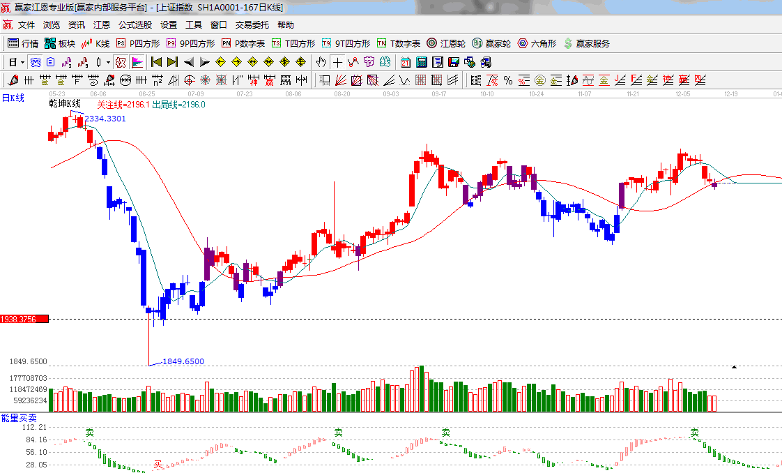 ★依據贏家江恩系統乾坤K線提示: K線顏色紅轉紫,多空博弈加大,等待信號的明確 ;