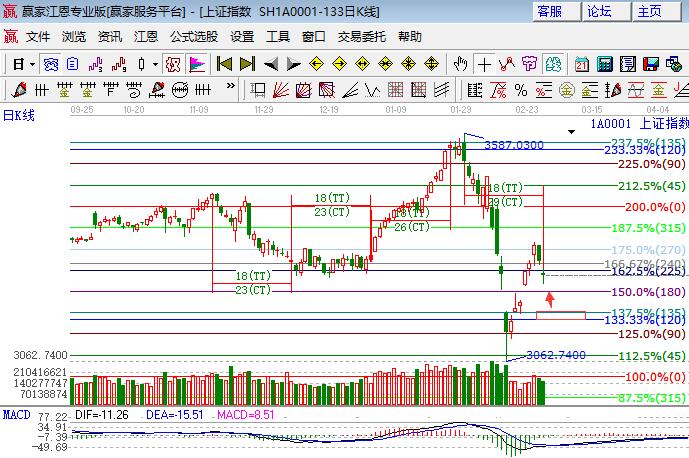 周三大盤延續大跌態勢低開震蕩再度下跌1%,砸盤的依然是藍籌權重,深市幾大幾指數則全線小漲,創業板盤中最高漲幅近2%。板塊方面,保險、釀酒、石油、銀行領跌,題材方面,開盤次新悶殺,科技屬性題材輪番表現,鄉村振興走勢轉弱,下跌個股略多,成交量進入遞減縮量。技術方面,隔夜外盤下跌,更加確認日線結束上攻展開二次碾壓動作,江恩百分比225度與240度對應點位3271-3287為盤中阻力,不能突破繼續向180度3222點,極強支撐是極反通道弱勢外軌線3180位置,上證50已回補一個缺口,百分比270度2880多空爭奪后看方向選擇,繼續下行回補下個缺口的概率較大,2825點及2800點為強支撐;創業板圍繞日線生命線震蕩,量能如保持修復生命線的幾率較大,待下個時間窗前守好生命線則為最佳走勢,下方1711點是支撐。操作上短線繼續休息,等待滬指確認極強支撐有效或下個時間窗附近時尋找機會。今日支撐3222、3200,今日阻力3271、3287,僅供參考,不構成任何投資建議。