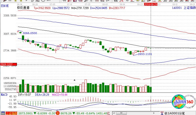 從盤面上看,知識產權保護、養殖、網絡安全、新疆振興、ST板塊、雄安新區等板塊漲幅居前;鈦白粉、高送轉、稀土永磁、新材料、蘋果概念、次新股等板塊跌幅居前。滬股通凈流入18億,深股通凈流入4億。相應的極反通道指標的支撐壓力提示,如下圖所示: