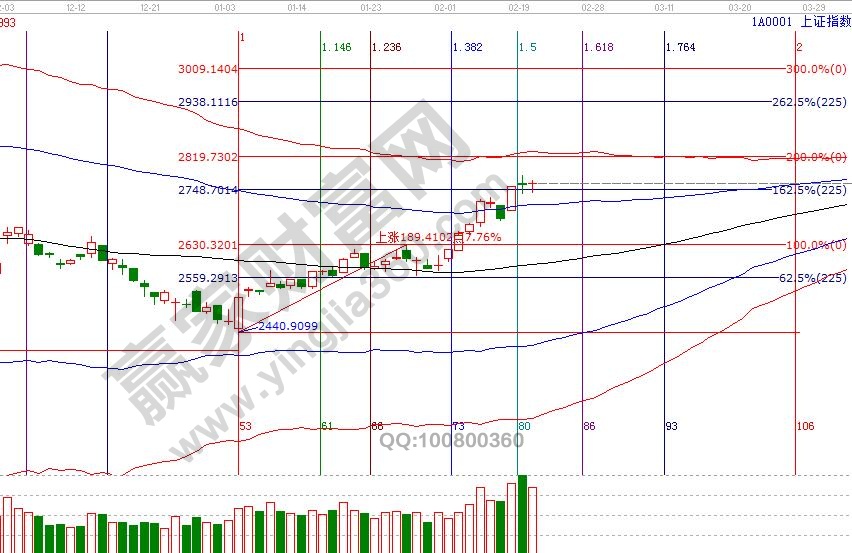 大盤延續在極反通道超強通道內運行,從時間周期和空間循環綜合看,市場向上運行動作還將延續,距離紅色上軌線2822空間有60點,結合短周期分析走勢會比較曲折。空間點位,江恩百分比、江恩四方形顯示,21號支撐是2747、2730點,2775、2778點是壓力,時間窗口是28號。操作策略,大盤日K線從強勢通道進入超強通道,個股波動空間增大,分批高拋藍色上軌線或紅色外軌線壓力個股,倉位切換至生命線附近有量能配合的個股,整體倉位保持在5-6成。