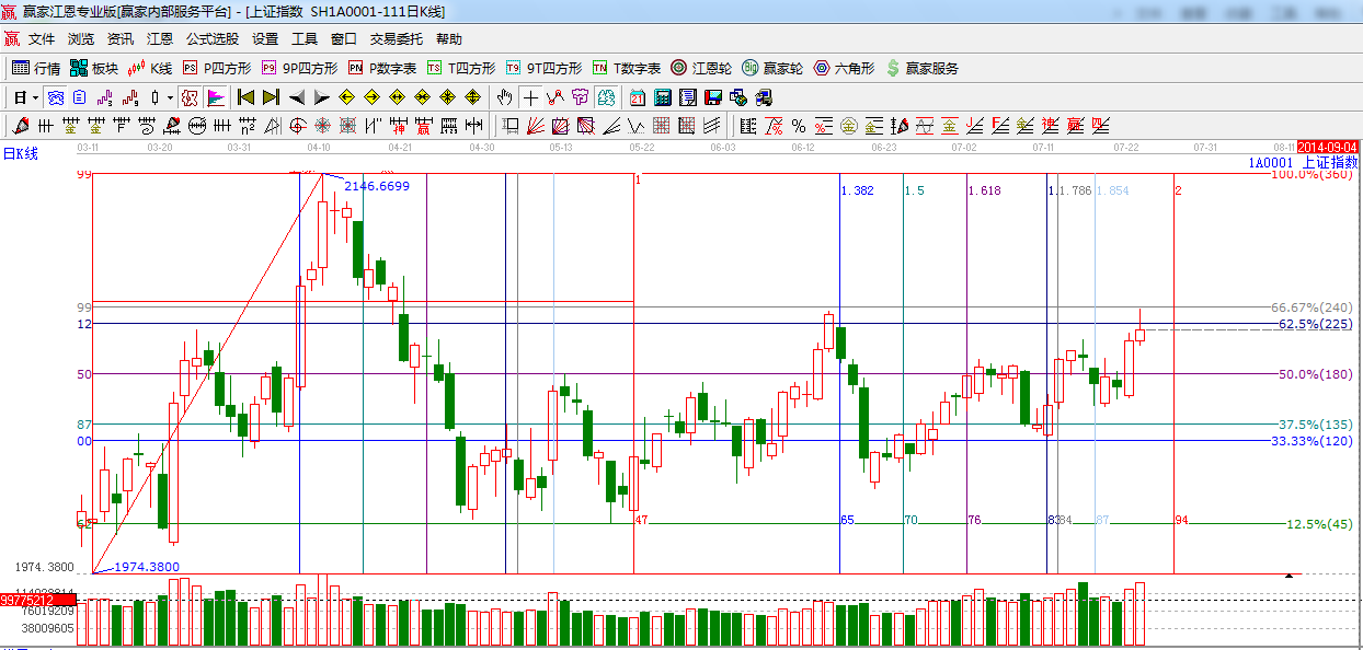 ☆依據贏家江恩系統波段百分比提示:早盤在權重的帶動下,攻擊昨天提到的江恩240度位置2089點阻力,隨后高位震蕩整理,明日依然關注江恩240度,225度阻力。