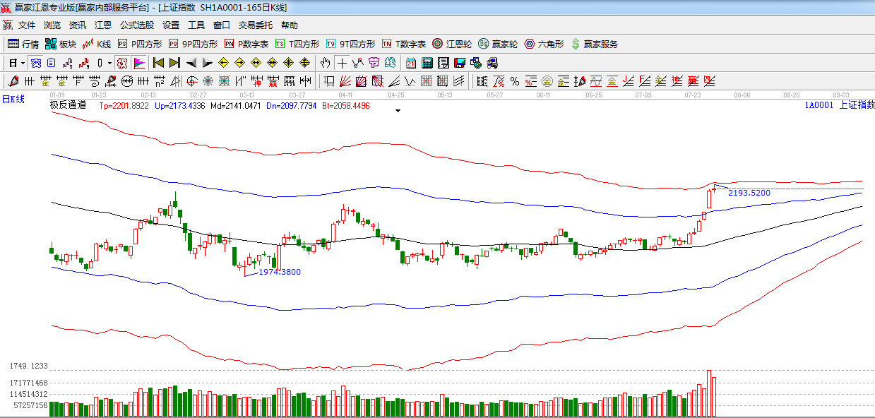 盤面上,個股板塊漲多跌少,航天軍工,國產軟件,鋰電池,倉儲物流等板塊表現活躍,藍籌股出現分化,鋼鐵、有色、煤炭等出現不同程度的回調,只有房地產和券商板塊上漲,今日題材股表現好于權重股,指數上攻動能在衰減,而且指數也逼近極反通道紅色外軌阻力線附近,預計短期大盤將沖高回落。