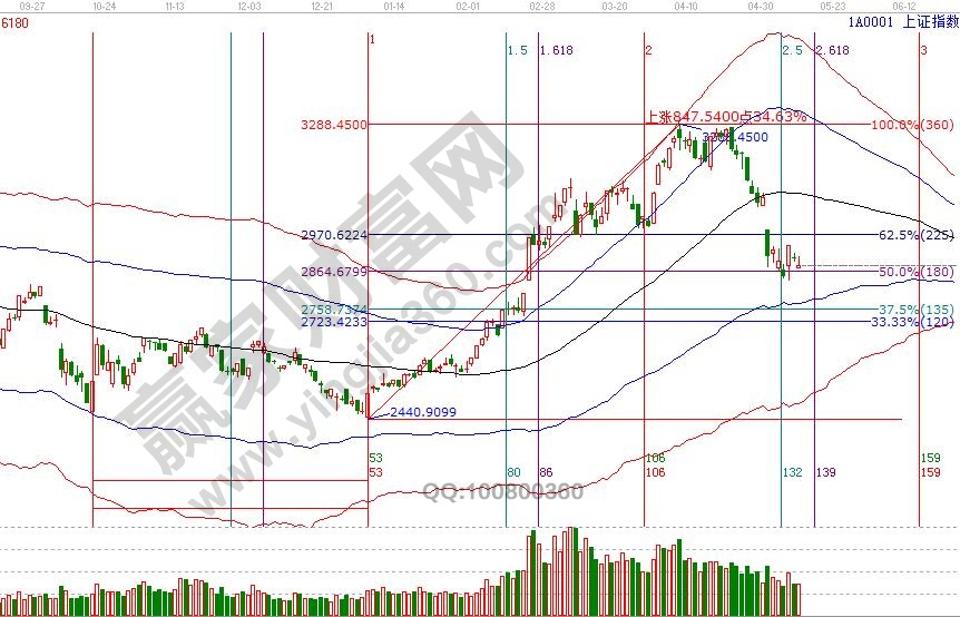 大盤延續極反通道生命線下弱勢通道運行,按贏家江恩十六字投資真言,時價共振短線反彈信號依然存在,隨著江恩時間窗口臨近,短線又將再度選擇方向,前期的快速下跌,市場需要時間積累能量化解短線壓力,按工具信號開倉的籌碼,要有足夠的耐心和充分的風險控制能力,應對策略可查看14號大勢分析。15號盤中支撐壓力是180度2928點、315度2944點,盤中支撐0度2860點,本周五17號是5月第二個時間窗口。操作策略,指數擊破黑色生命線,藍色下軌線是回撤目標位,高風險者倉位3-4成,低風險者等待中期參考位。