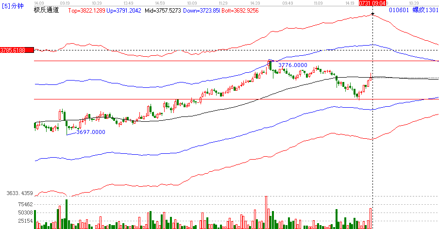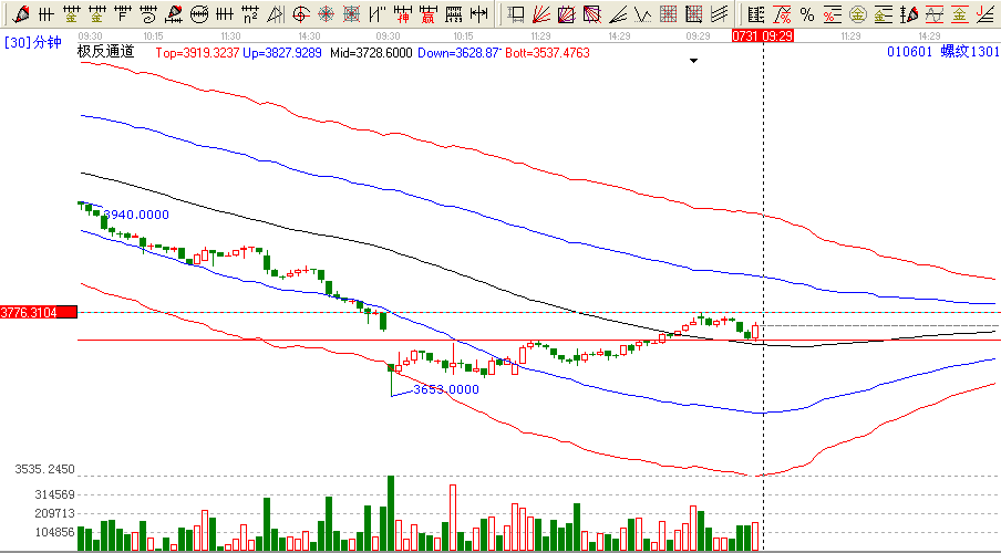 2012.07.31日螺紋分析:關注今日的高點3776點壓力【5分跟15分極反通道上軌的壓力點位3792點下方在3736的支持力度3730【極反通道30分15分的共振點位置】高空低多,震蕩格局。