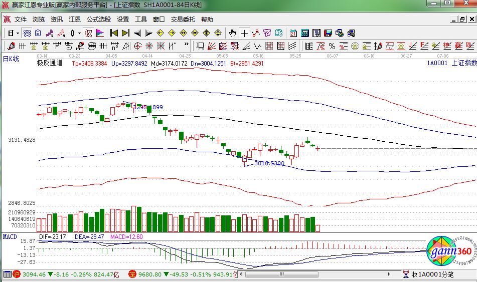 贏家江恩軟件是一款非常不錯的股票分析系統,特色極反通道指標是一種萬能指標,對于長中短線以及波段操作者都是適用的,而且其中蘊含著眾所哲學思想,是可以充分的顯示處股價趨勢的強弱的。如上圖,現在大盤正處在極反通道黑色生命線下方,顯然是處于弱勢的區域。