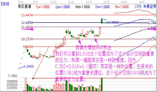 接下來我們看后市的兩次短線機會,江恩理論總結成一句話:研究歷史預測未來。我們從這前兩次的運行發現,黃金分割比例在這股票的運行中發揮了比較重要的作用,那么后市呢?從下圖中我們不難發現另外一個重要的位置那就是0.618位置成為重要的壓力位置;還有就是后市的兩次KDJ敏感指標異動的時候都是處于價格支撐位置,從形態上講是處于箱體的底部,這些都說明了這是買入的位置。