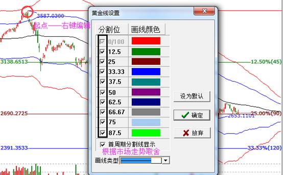 4.工具編輯。把鼠標(biāo)移動(dòng)到所選起點(diǎn)處,鼠標(biāo)會(huì)變成十字狀,點(diǎn)擊右鍵——編輯江恩百分比,出現(xiàn)如下圖,可根據(jù)自己的經(jīng)驗(yàn)需求,留下你認(rèn)為重要的分割位,點(diǎn)擊確定即可。經(jīng)常用的設(shè)為默認(rèn)。