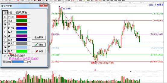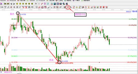 ? 適用:結(jié)合當(dāng)前走勢(shì),如果正處于一個(gè)重要上升波段或回調(diào)波段中間,則可以用此工具對(duì)該波段進(jìn)行分割,得出支撐壓力。該工具對(duì)于創(chuàng)歷史新高/低的股票不適用。