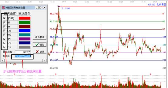 (二)研發(fā)原理:江恩波動(dòng)法則、江恩圓及分割。該工具是將經(jīng)典的江恩螺旋四方轉(zhuǎn)化到K線圖形中,以便用戶更直觀的結(jié)合具體走勢(shì)發(fā)現(xiàn)價(jià)格波動(dòng)規(guī)律。以一個(gè)重要的歷史高點(diǎn)或低點(diǎn)作為循環(huán)起點(diǎn),按照螺旋數(shù)列計(jì)算所得到的重要點(diǎn)位,將是未來市場(chǎng)的重要支撐或壓力位。